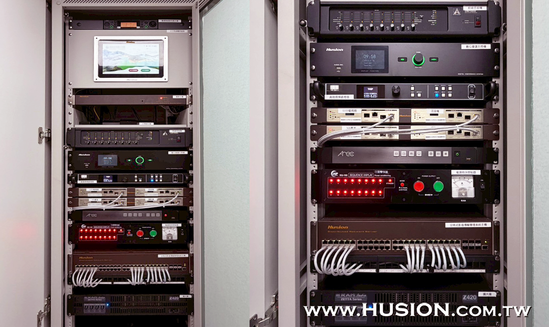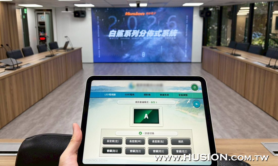 本案我們協助經銷商規劃設計一間防災應變智能會議室,搭配Husion湖森-IMIS分佈式影音控制傳輸管理系統,並透過一台手持無線平板及機櫃內嵌備援平板,可達到資訊同步互聯互通,靈活操控所有設備,包涵180吋LED電視牆、2台65吋電視、3台攝影機、主席麥克風、20位列席麥克風、設備音量等;其中電視牆共有三大模式可依實際需求選擇,三大模式中分別有多種預設電視牆版型可供選擇,可隨意切換版型與訊號源設定,或顯示子母畫面,例如將母畫面投放簡報資料,子畫面投放現場攝影機追蹤畫面。