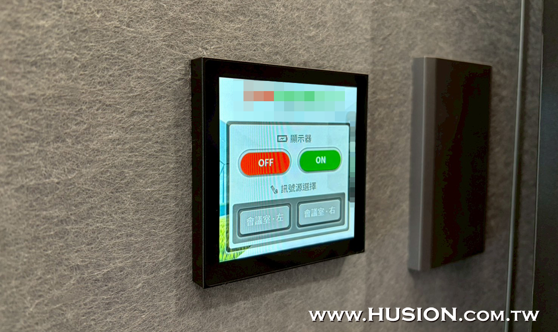 除此之外,二間獨立會議室顯示器分別選用了新品Husion CCU DB4E-T 4吋嵌入式觸控面板,此為全貼合電容觸控式螢幕,搭載雙核心晶片,運行速度極快,480X480解析度及超窄邊框設計簡約,卻功能強大,將繁瑣之操作流程整合簡化,使操控更加直覺簡單易用,適用於各類型工商產業等應用場合。