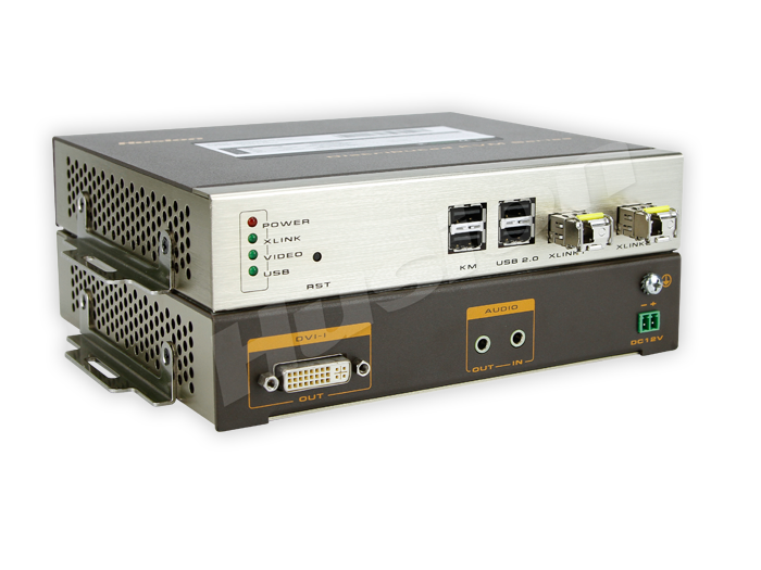 ・透過兩條熱備份的光纖接收來自遠端的影像、立體聲音訊、USB、滑鼠和鍵盤訊號,傳輸距離 10km(最大 120km)。
